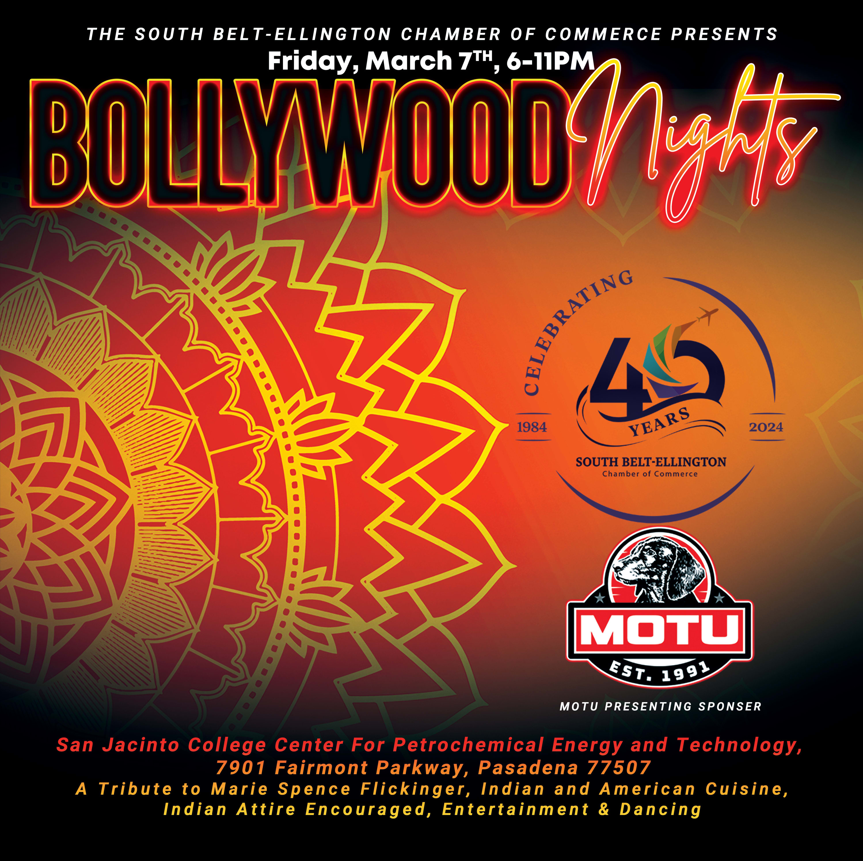 Join us for a unique experience. This is the first American Chamber Bollywood event in Harris and Galveston counties. Attendees can enjoy a blend of traditional Indian cuisine and American food, spectacular entertainment, dancing, and plenty of fun! The chamber will pay tribute to co-founder Marie Spence Flickinger.Images